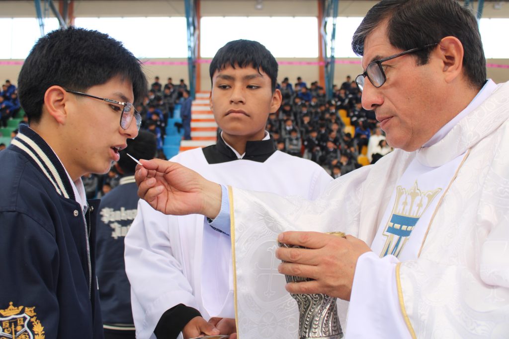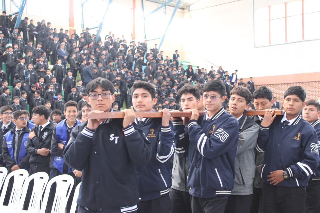 La celebración se llenó de emoción con la llegada de la Cruz de las Promociones, entregada por los estudiantes de la promoción de ambas casas salesianas de Huancayo, quienes la trajeron desde la ciudad blanca de Arequipa. Este signo tan significativo nos une y prepara el camino hacia el IV Encuentro Nacional de Promociones Salesianas, que se llevará a cabo el próximo año en nuestra ciudad incontrastable.