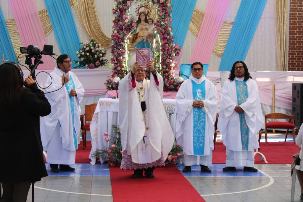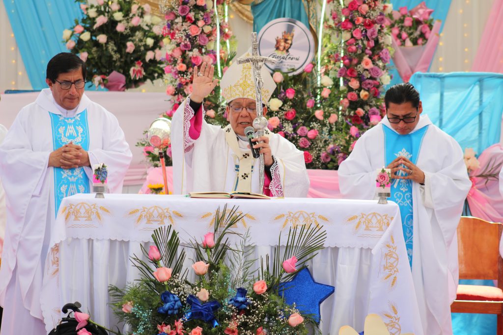 El sábado 24 de mayo, la Fiesta de María Auxiliadora tuvo su punto más alto con la Eucaristía Central en el Coliseo del Colegio Santa Rosa, presidida por el Arzobispo de Huancayo, Mons. Luis Alberto Huamán Camayo, O.M.I., y concelebrada por los  salesianos sacerdotes P. Humberto Chávez Franco SDB, P. Fredy Valdivia Olarte SDB y P. Saúl Quispe Caballero SDB. En su homilía, el Arzobispo destacó a María como » la primera manifestación del servicio que se refleja en el ministerio de Jesús en el mundo, y que en las bodas de Caná (…) presenta a la Auxiliadora en los momentos importantes. (…) Padre Humberto, les tengo una sana y hermosa envidia con la familia salesiana, porque ustedes han logrado que en cada hogar la Madre de Jesús, María Auxiliadora tenga un lugar importante en la familia».